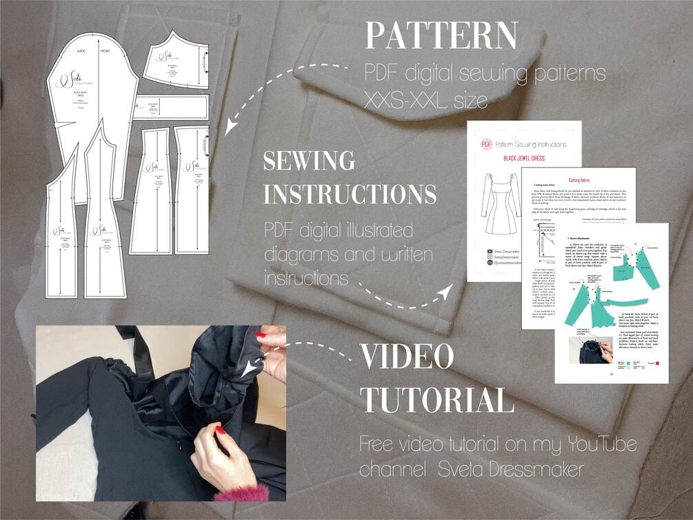 1 pdf of patterns ( Black_Dress_xxs_xxl ) - 1 pdf of Sewing INSTRUCTION book with fabric choice, pattern printing and assembly, size chart, pattern layout, cutting, sewing detailed illustrated process.