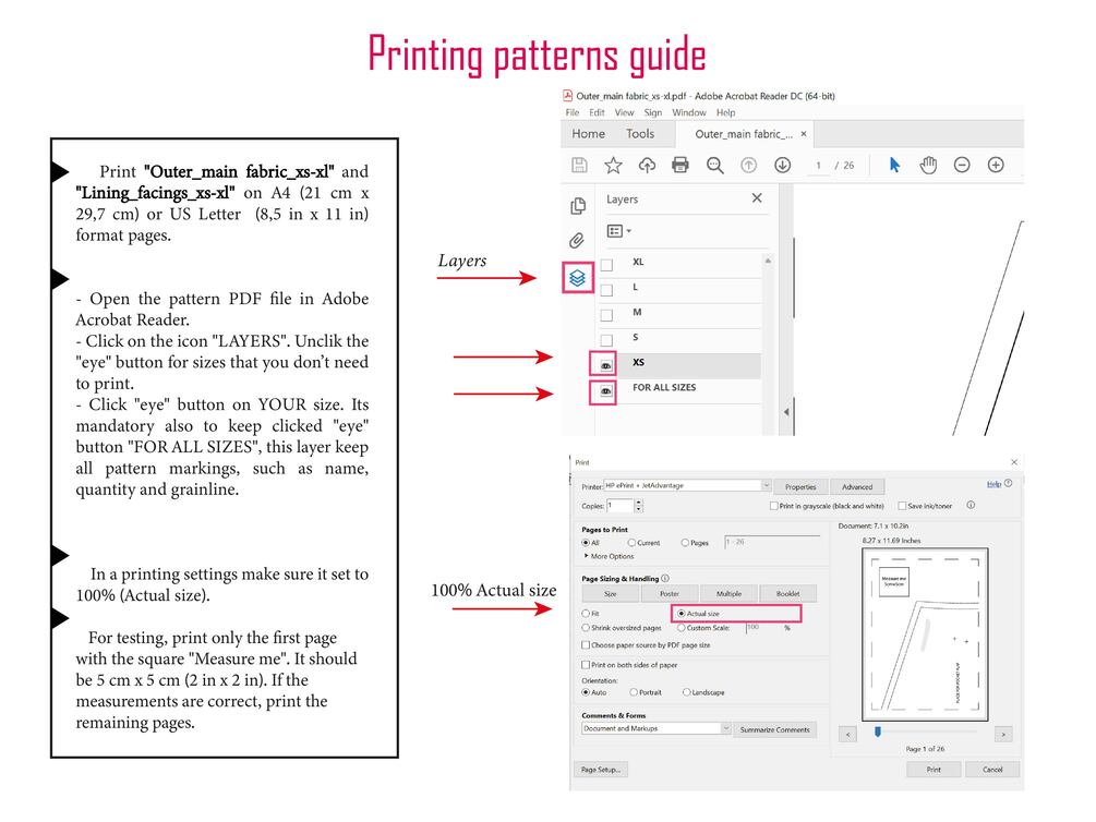 - 1 pdf of Sewing INSTRUCTION book with fabric choice, pattern printing and assembly, size chart, pattern layout, cutting, sewing detailed illustrated process.